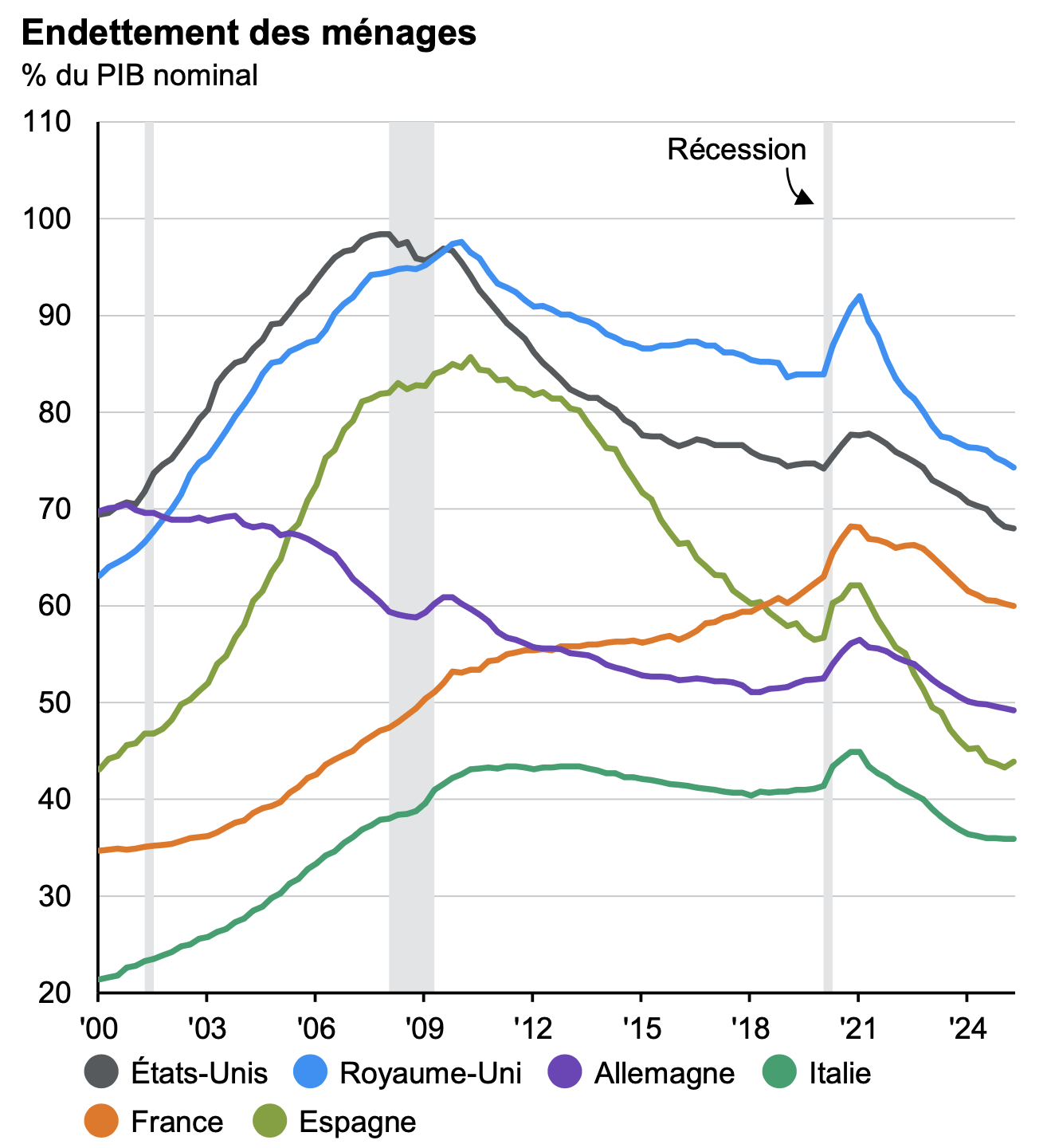 - Les ménages sont moins endettés, conséquence du marché immobilier grippé. Le taux d'épargne augmente fort en Europe, diminue aux USA. Effet des droits de douane ?